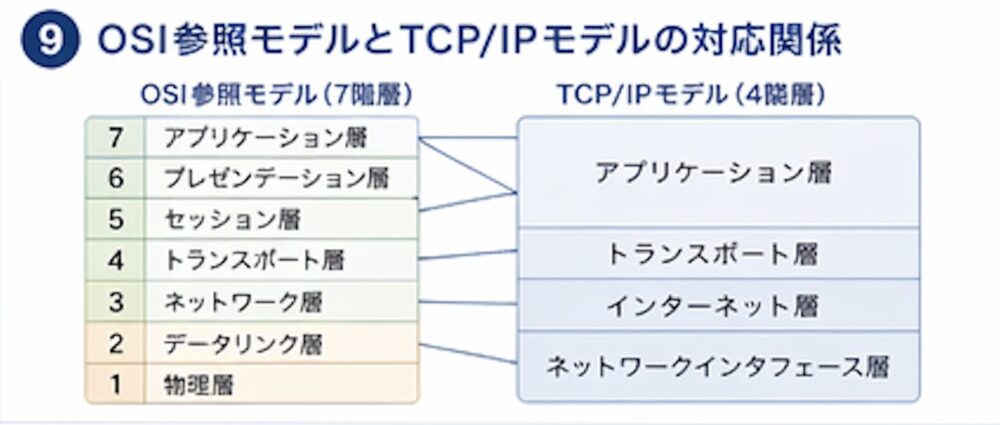 OSI参照モデルとTCP/IPモデルの対応関係はこのようになります。