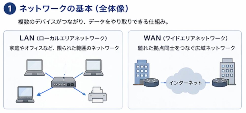 ネットワークは規模によって大きく2つに分類されます。LAN(Local Area Network)は、オフィスや家庭など限られた範囲のネットワークです。学校の教室内にあるパソコン同士をつないだネットワークがまさにLANです。一方、WAN(Wide Area Network)は、離れた拠点同士をつなぐ広域のネットワークです。東京本社と大阪支社をつなぐネットワークはWANにあたります。インターネットは世界最大のWANとも言えます。試験ではLANとWANの違いや、それぞれに使われる技術について問われることがあるので、まずこの区分をしっかり覚えておきましょう。