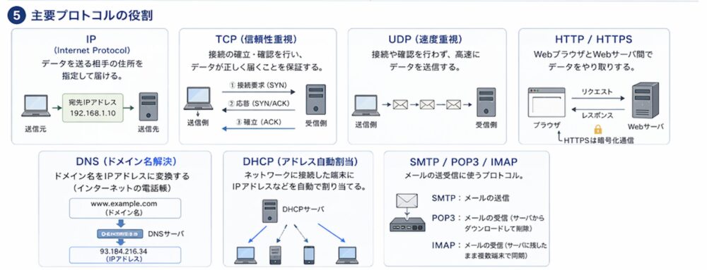 一方、UDPは「速度重視」のプロトコルです。接続の確立や到達確認を行わないため、通信が高速です。動画のライブ配信やオンラインゲームなど、多少のデータ欠落よりもリアルタイム性が求められる場面で使われます。試験では、TCPとUDPの特徴の違いを問う問題が定番です。「信頼性のTCP」「速度のUDP」と覚えておきましょう。