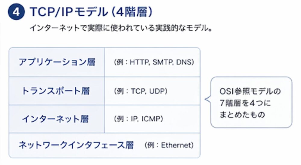 OSI参照モデルが理論的な枠組みであるのに対し、TCP/IPモデルはインターネットで実際に使われている通信モデルです。こちらは4つの層で構成されます。下から順に、ネットワークインタフェース層、インターネット層、トランスポート層、アプリケーション層です。OSI参照モデルの7層をシンプルに4層にまとめたものと考えると分かりやすいでしょう。実務的にはこのTCP/IPモデルのほうが重要であり、試験でも頻繁に出題されます。