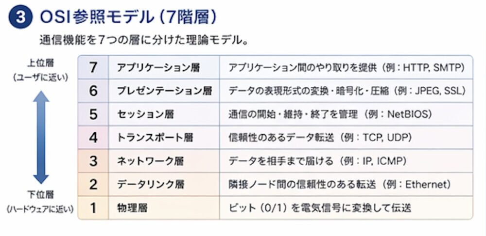 ネットワーク通信を理解するための基本的な枠組みが、OSI参照モデルです。これは国際標準化機構(ISO)が策定した通信の理論モデルで、通信機能を7つの層(レイヤー)に分けて整理したものです。下から順に、第1層:物理層、第2層:データリンク層、第3層:ネットワーク層、第4層:トランスポート層、第5層:セッション層、第6層:プレゼンテーション層、第7層:アプリケーション層となります。
