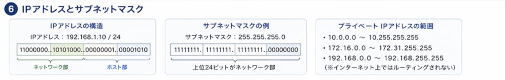 また、インターネット上で直接使えるグローバルIPアドレスと、組織内ネットワークで使うプライベートIPアドレスの区別も重要です。プライベートIPアドレスの範囲(10.0.0.0〜10.255.255.255、172.16.0.0〜172.31.255.255、192.168.0.0〜192.168.255.255)は試験でよく問われるので、しっかり覚えておきましょう。