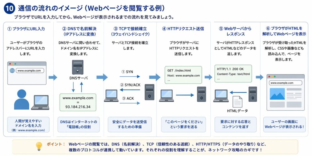 最後に実際の通信の流れについて、Webページを閲覧する際を例としてわかりやすく説明します。