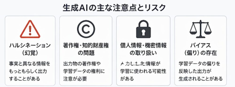 生成AIは非常に強力なツールですが、万能ではありません。私は必ず「できること」と同時に「できないこと・気をつけるべきこと」をセットでお伝えしています。注意点とリスクを簡単にまとめると下のような形です。