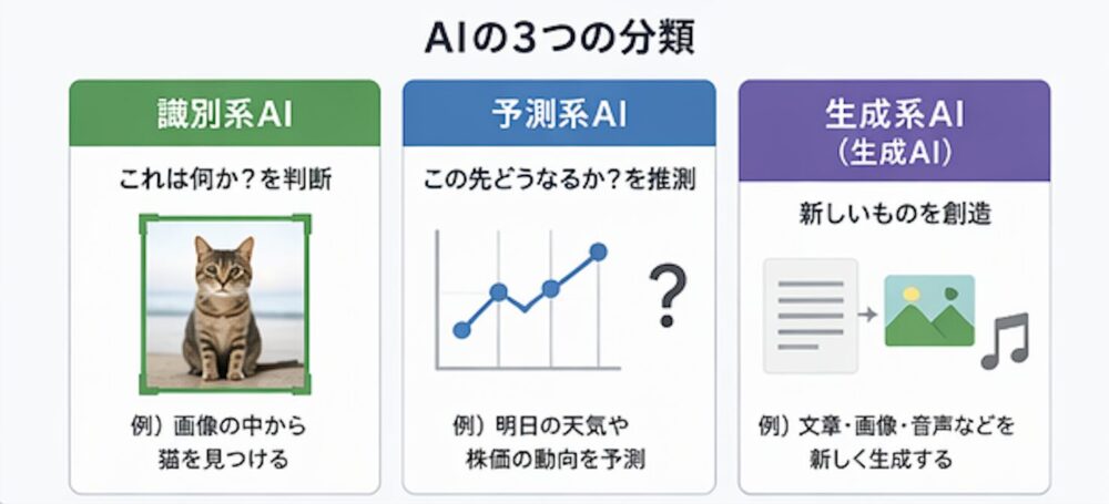 ③ 生成系AI(生成AI):文章・画像・音声・動画などの新しいコンテンツを「つくり出す」AI。