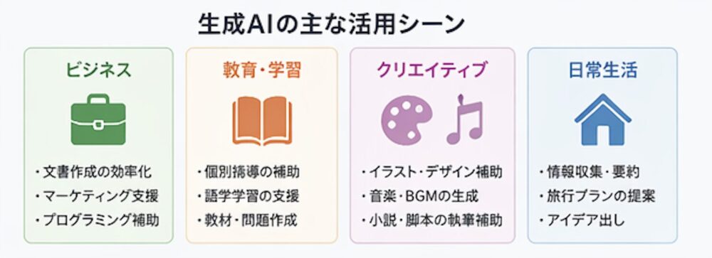 生成AIの仕組みが分かったところで、具体的にどのような場面で活用できるのかを見ていきます。簡単に分けるとこのようになります。