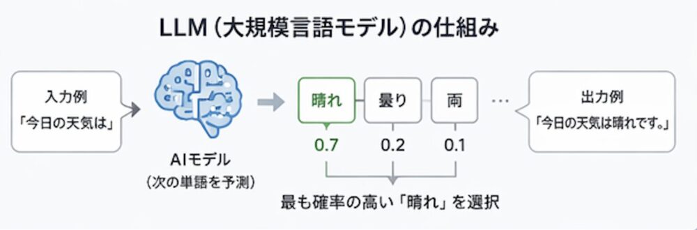 LLMが行っていることを極限まで単純化すると、「ある文章の次に来る可能性が最も高い単語を予測し続ける」ということです。たとえば「今日の天気は」という入力に対して、「晴れ」「曇り」「雨」などの候補の中から、文脈上最も自然な単語を選び、さらにその次の単語を選び……という処理を高速で繰り返すことで、まとまった文章が生成されます。