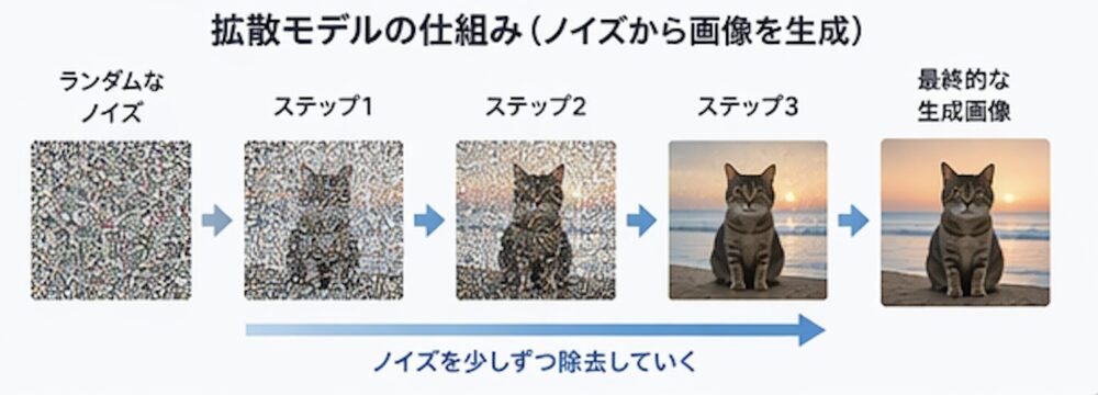 ユーザーが「夕焼けの海辺に立つ猫」と入力すると、AIはランダムなノイズ画像からスタートし、テキストの意味を手がかりにしながら、少しずつノイズを除去していきます。最終的に、指示に合った画像が浮かび上がるのです。イメージとしては下のような感じです。